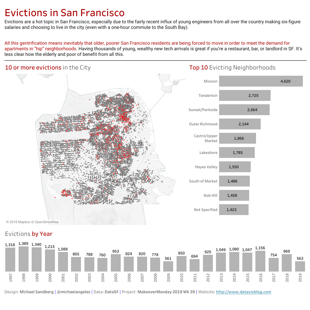 I have been itching for a #MakeoverMonday with the possibility for a map for a while. I see this situation as rather bleak, so I used two (maybe three) bleak colors: a darker grey and a darker red. I wanted to keep it stripped down, so I did not add anything more than the title, map, top 10 neighborhoods affected, and the number of evictions per year.