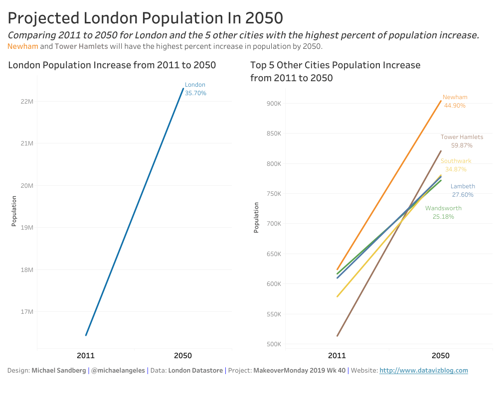 The slope chart is the line chart’s fraternal twin. Line charts display three or more points in time while slope charts display exactly two points in time.