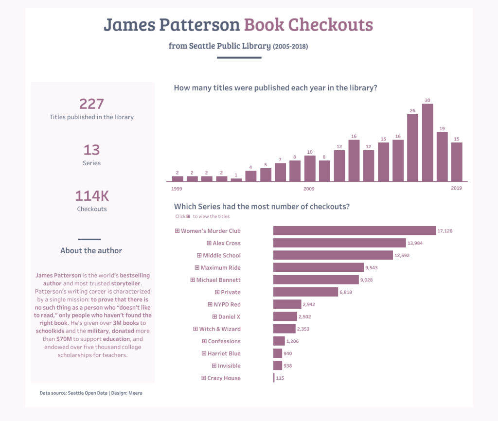 Michael: Hello Meera. I have been a big fan of your work for a while. Congratulations on having 4 of your data vizzes selected for the longlist by Kantar Information is Beautiful Awards 2019.