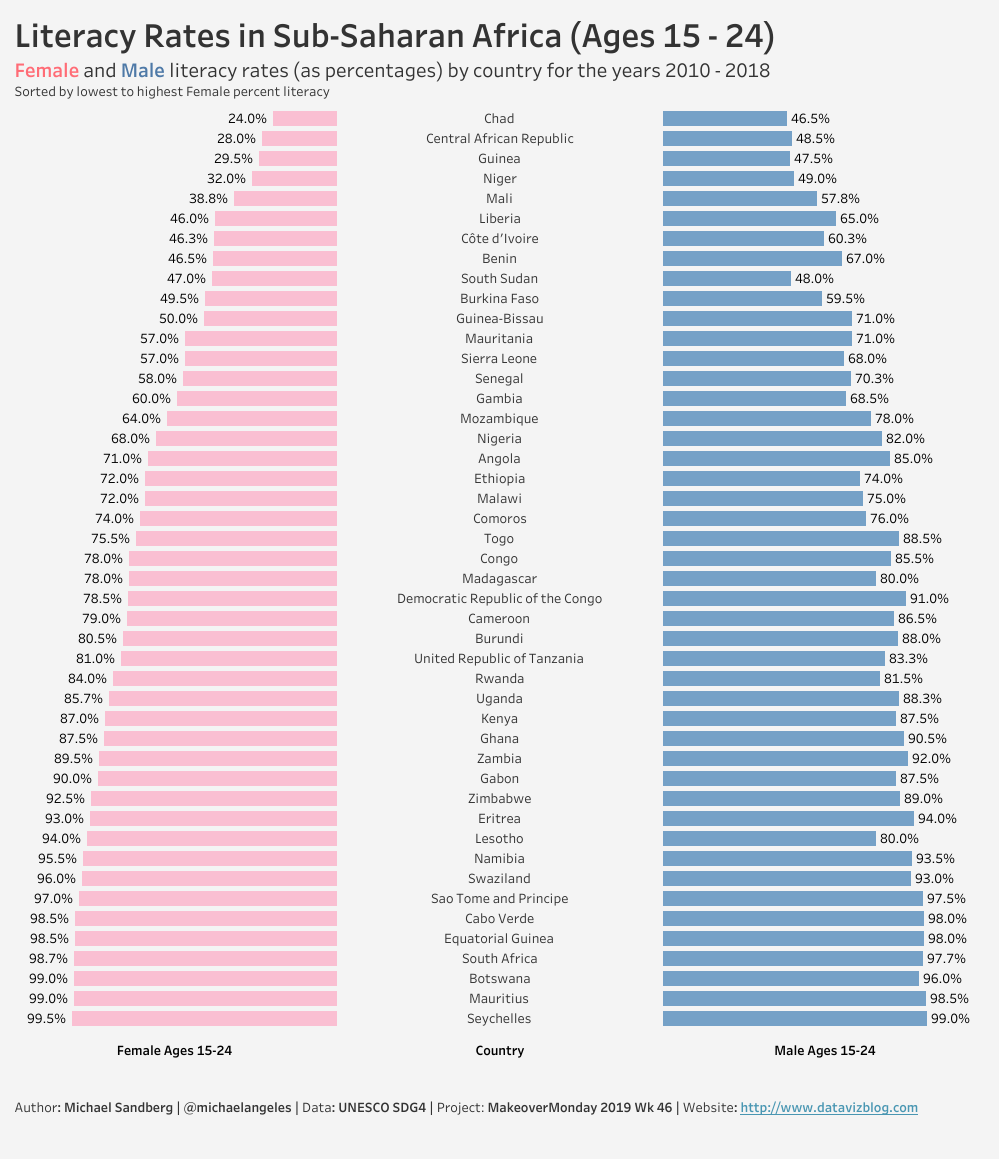 It has been a very busy week at work, so I kept it real simple. I was interested in trying to create a Butterfly Chart. A Butterfly Chart is two bar charts on either side of the y-axis. I also wanted the Country names to be in the center, so I did a little trick by creating a measure called Zero Axis, dropped it between the Female and Male metrics on the Columns, and added Country Name to the Text mark on Zero Axis.