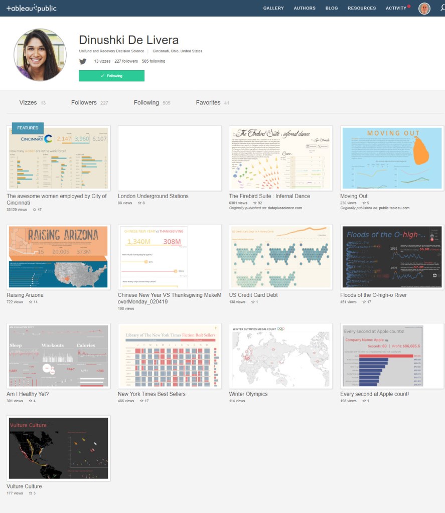 Dinushki: I am currently working on a website that I would like to launch along with my first blog post about my Firebird viz. Life gets in the way sometimes and stuff like this gets pushed back. I build dashboards at work so often that I’m going to start putting some of those looks and techniques out there. I wish to be more active on Tableau Public this year after the launch of my website. Be on the lookout for something from me soon.
