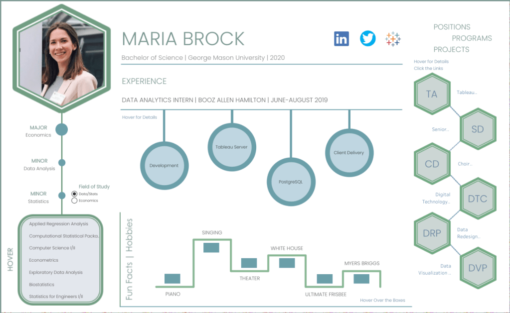Maria: Thank you so much Michael! My resume was definitely interesting to create. I decided to create an interactive resume after one of my coworkers suggested it, and I realized how valuable it is to have a resume dashboard that literally shows your Tableau skills! When I looked at Tableau’s interactive resume gallery and other examples, I noticed that there were a lot of gantt charts and skill bar sections used and I got a little discouraged. At that point in my life I didn’t have much experience, so I didn’t really have an experience “timeline” that I could create a gantt chart with, and I didn’t like self-quantified skill sections because they’re too subjective. I decided to close Tableau and sketch out design ideas on paper. My resume is definitely “content driven design” and “design driven structuring”. I knew that I had to be creative in my chart types because of my minimal experience, so I decided to go with these shapes and hovers you see to highlight things like programs, projects, and positions I’ve had. I also included a section where people can hover over the classes I’ve taken and learn what exactly those classes teach. I also knew I wasn’t using this resume for purely business reasons so I wanted to include a personal hobbies and fun facts section. My resume is unconventional in design, but I’ve received positive reviews from people who said that they were interested enough to look further into my resume to play with it, so I consider that a win!