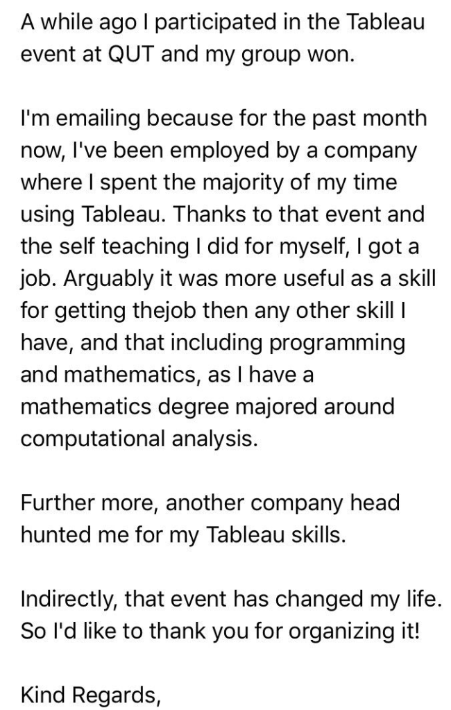 My other light-bulb came when a student that participated sent me this nice message (screen shot below), saying that this event and Tableau changed his file.