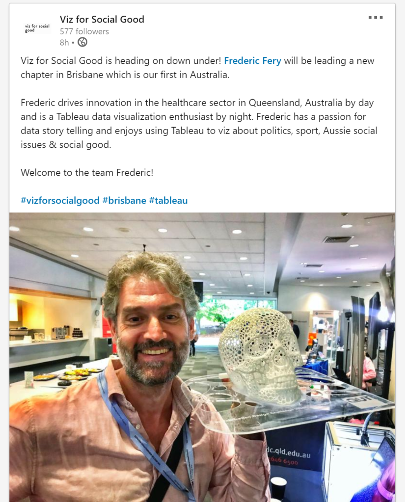 Frederic: Yeah I’m pretty stoked to start the first Viz For Social Good chapters in Australia – we are putting Brisbane on the map!