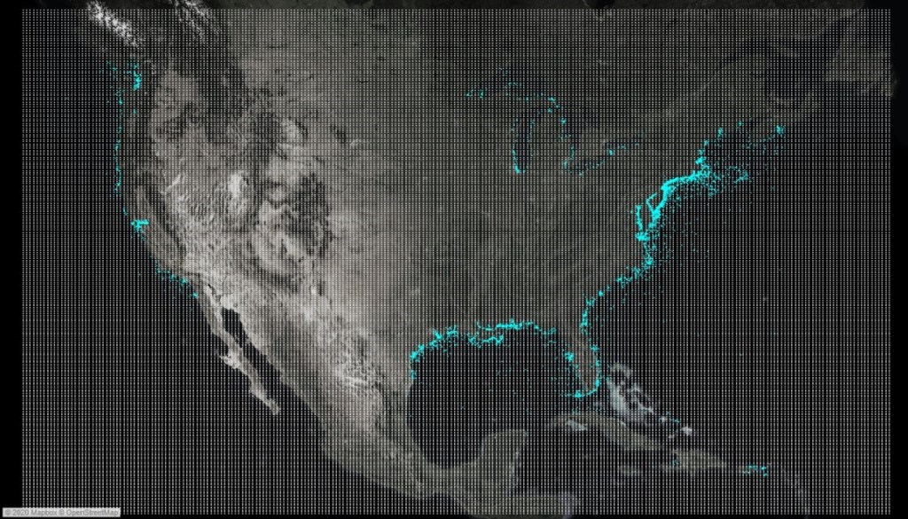 I wanted the viz to be very interactive, something that would really let users explore the data. Ken Flerlage, in his post Fun With Tableau 2019.2 Parameter Actions shared a really cool technique, combining parameter actions and an invisible grid that would capture the x and y coordinates of wherever the user placed their mouse. In my case, I created a grid of 62,500 lat/lon points covering the entire Contiguous U.S. Here’s what the map looks like with the grid visible.