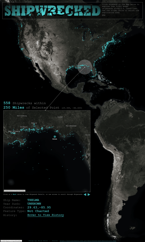 Michael: Hello, Brian. I loved your #IronQuest submission, Shipwrecked. I am a big follower of stories on the findings of sunken ships. I had the good fortune of meeting Dr. Robert Ballard many years ago after he found the Titanic. Can you tell my readers the process you followed to develop this (e.g., find the data, analyze, and design the dataviz)?