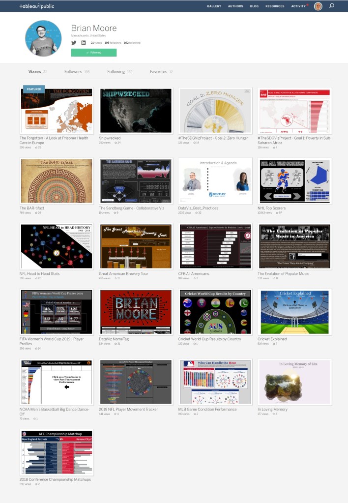 I am a senior Data Visualization & Analytics Consultant at Cleartelligence, Inc., a co-organizer of the Boston Tableau User Group, a co-organizer of #TheSDGVizProject, and all-around Tableau Fanatic. I have been working with data in various analytical roles for over a decade but was introduced to Tableau about 5 years ago by my incredibly talented wife, Jacqui Moore (she taught me everything I know 😉). Since then, my career has been centered around Data Visualization, but it wasn’t something I was really passionate about until about a year ago when I discovered the incredible online community (again, thanks to my wife). To say that the community has motivated and inspired me would be a serious understatement. Now, I spend my days building dashboards for clients and my nights building dashboards for community projects, data viz competitions, and mostly, just for fun.