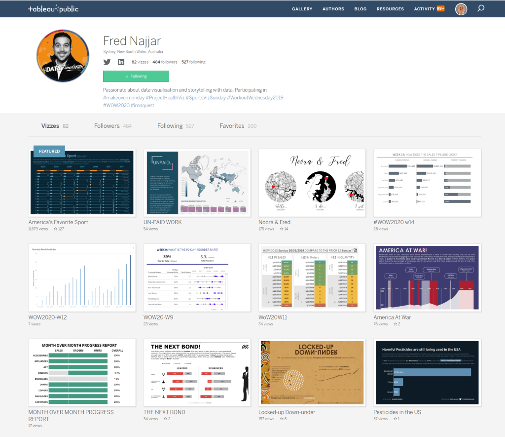 Here is a link to Fred’s Tableau Public page. The screenshot below shows a partial list of some of his datavizzes.