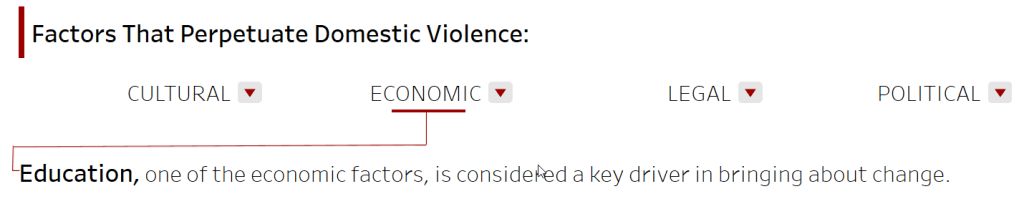 My frustration during the making of the viz came from the fact that acceptability of domestic violence is a very multifaceted problem and education is just one factor. Among many other factors, when male patriarchy is deeply rooted in a society and there is little or no legal consequences for the perpetrator, then suffering through domestic violence is the only way of life the victims know. I tried to incorporate these factors in my viz by listing the various reasons that perpetuate domestic violence, taken from UNICEF research and publications.
