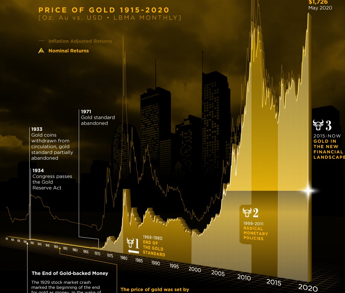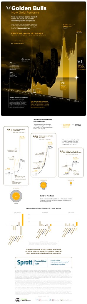 Source: LePan, Nicholas, Golden Bulls: Visualizing the Price of Gold from 1915-2020, visualcapitalist.com, May 27, 2020, https://www.visualcapitalist.com/golden-bulls-the-price-of-gold/