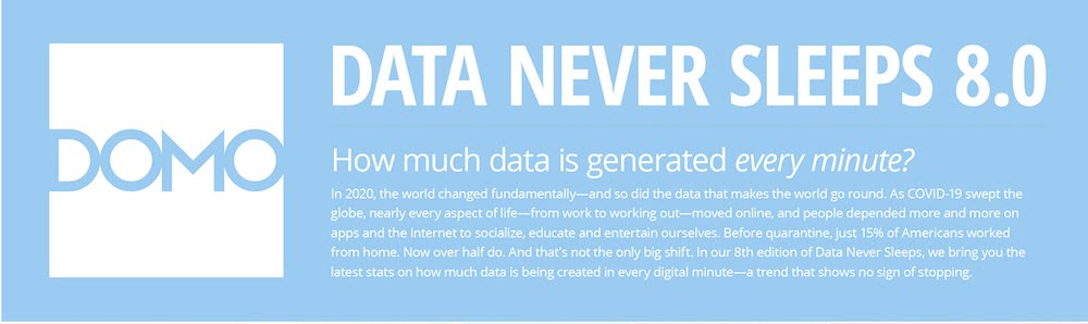 In Domo’s eighth edition of Data Never Sleeps, you’ll get a surprising glimpse at how much data was generated by the minute, shedding insights on in-home entertainment, finding new ways to connect and the future of work.