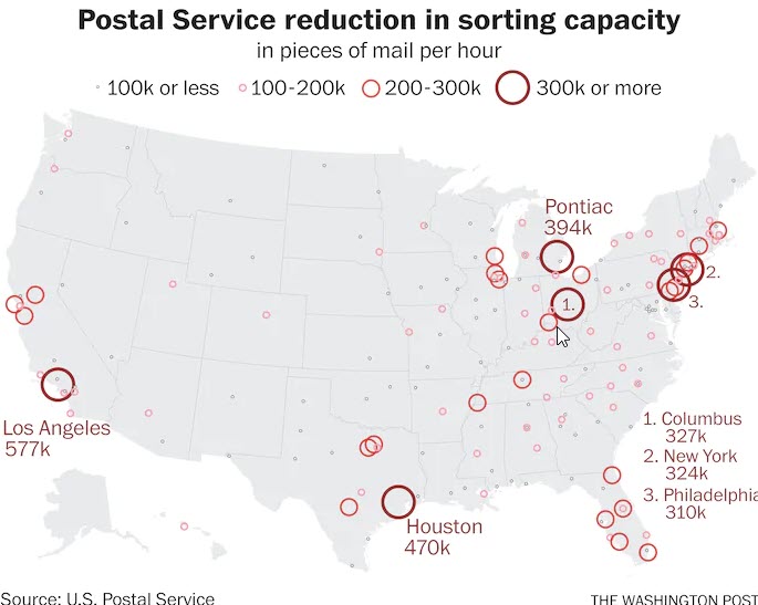 The United States Postal Service has lost mail sorting machines as an election during a pandemic draws closer. Louis DeJoy, the new postmaster general, is a former logistics executive and ally of President Trump. He has already removed numerous mail sorting machines, and reduced sorting capacity, as depicted in the map below. Click on the following link to read the full report in The Washington Post (here).