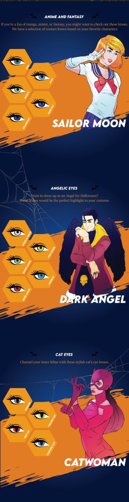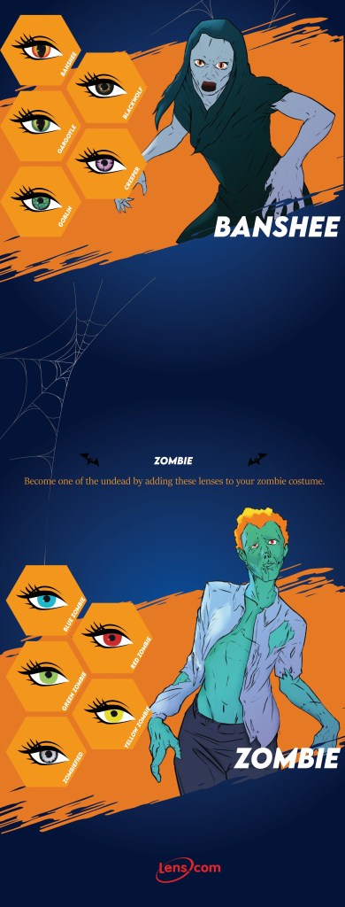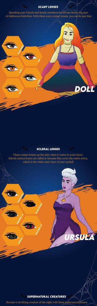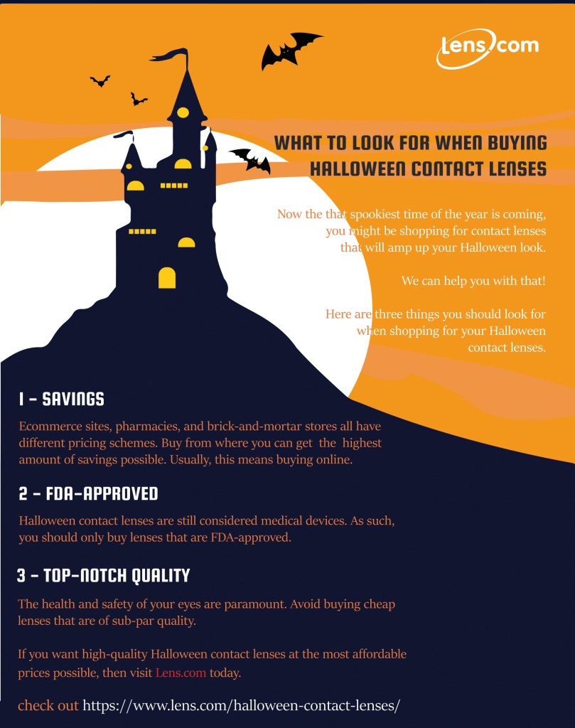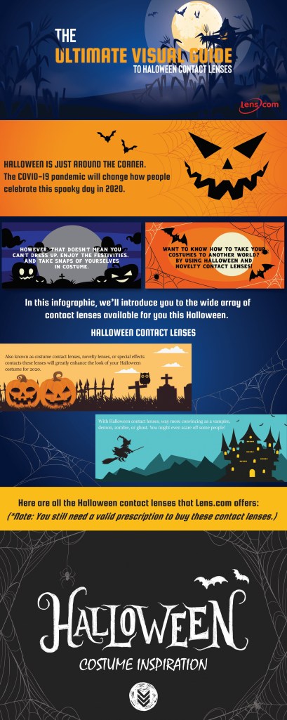 Halloween may be a little different this year. So when you dress up, socially-distance, and snap those pictures, you’ll want to go for the maximum effect. Lens.com offers a wide range of FDA-approved, prescription Halloween contacts to take your Halloween look to an other-worldly level. Below is their infographic that will help you make sense of costume lens terms and categories, and with what costume they can be paired up.