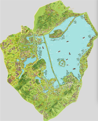 It is a freshwater lake with a basic pattern of “one mountain, two towers, three islands, three banks, and five lakes”. It covers an area of 6.38 square kilometers. The average depth is 2.27 meters with he deepest being 5 meters. The lake is divided into 5 parts by the causeways of Su Causeway, Bai Causeway, and Yanggong Causeway. and there are numerous temples, pagodas, gardens, and natural/artificial islands within the lake. Three sides of the lake are surrounded by green mountains and one side the modern city.