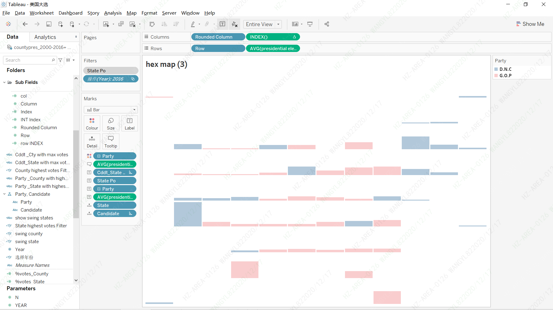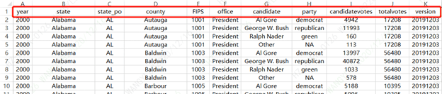 Here in China, Tableau officials organize a visualization challenge with a selected topic every month, and the data set related to the topic will be provided for participants. The theme of this month is about the US presidential election. The data set is as follows, including year, state, county, candidate, party, number of votes, etc.