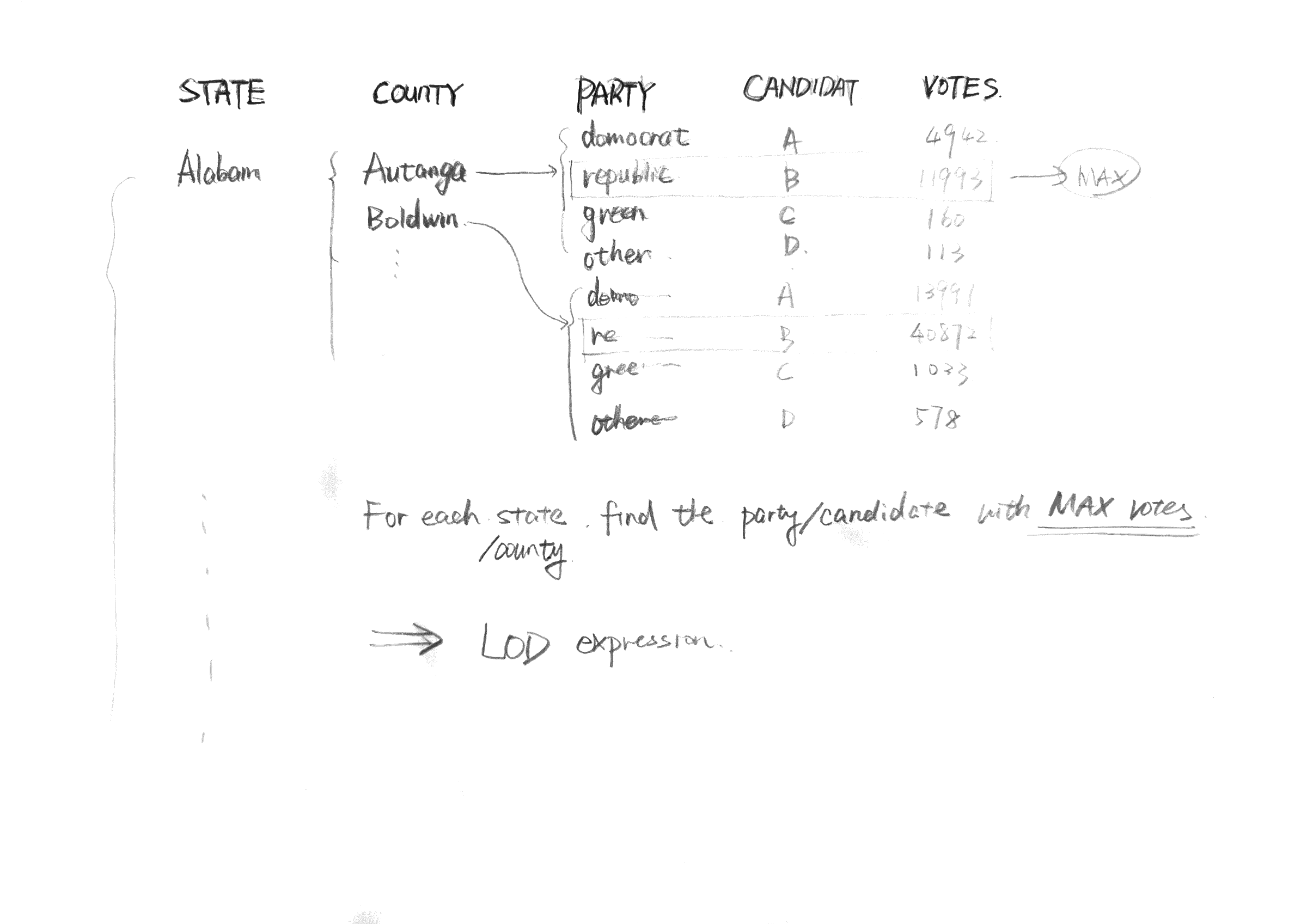 - Find the party/candidate with the highest number of votes: I used some LOD expressions to find the party / candidate with the highest number of votes in each state / county. In the figure below, I simply draw the structure of this data set.