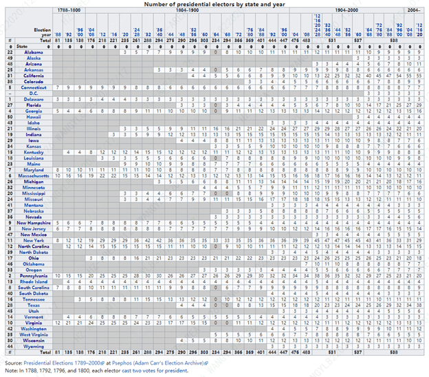 Then, I collected some information and data about United States Electoral College and Electoral Votes from Wikipedia, as the table shown below, the number of presidential electors by state and year.