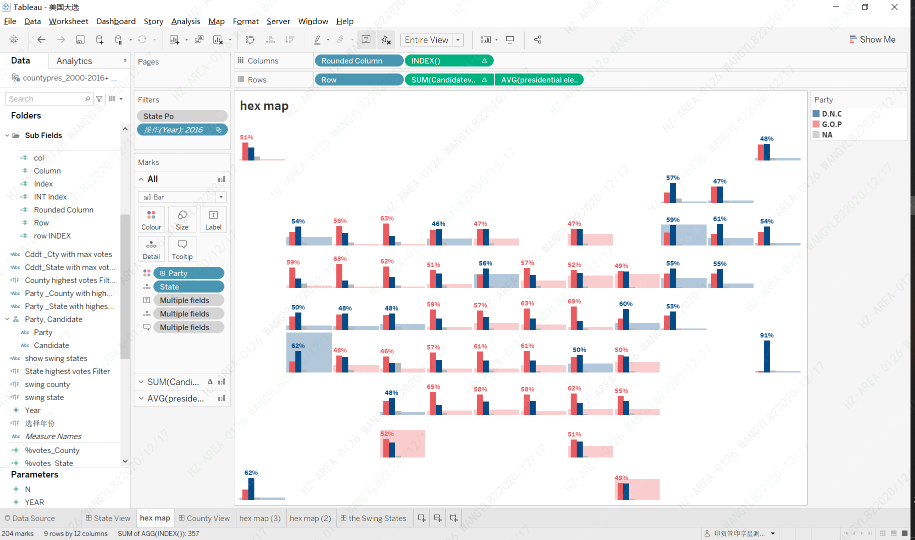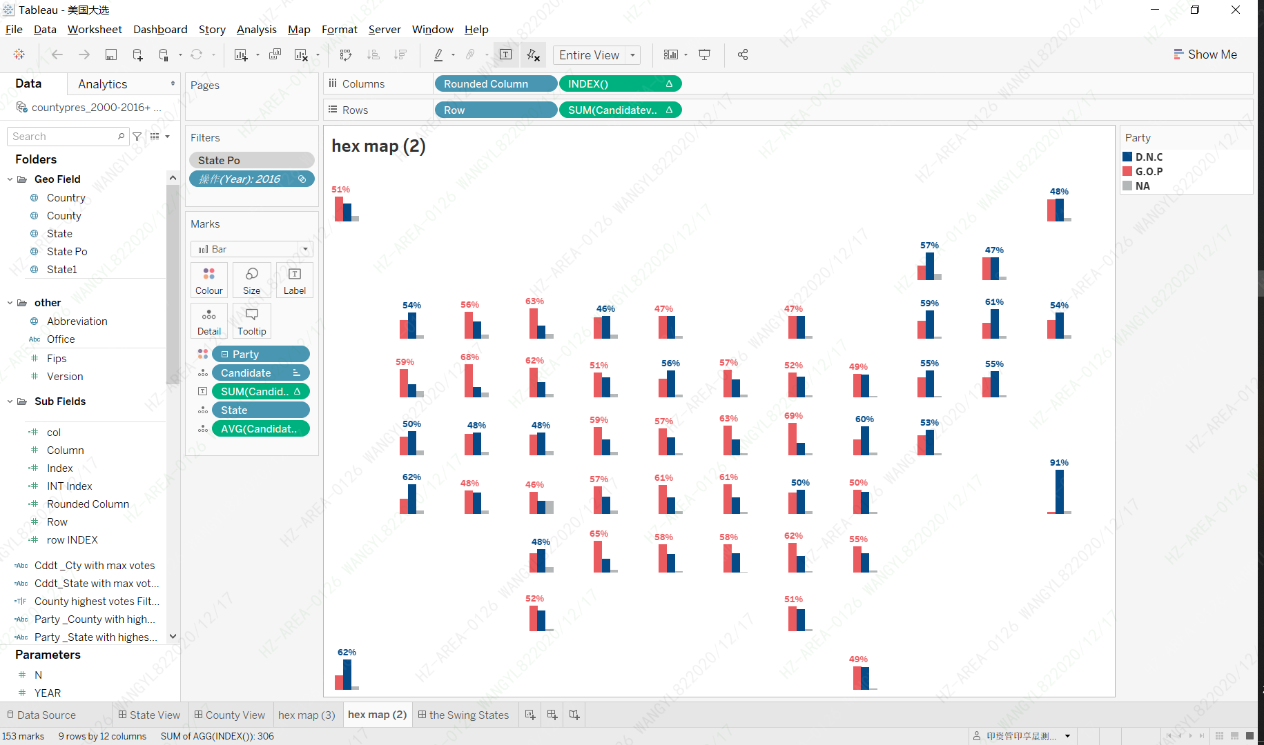 - I try to show the major factors on the tile map, I use bar chart to show the percentage of votes for each candidate, and use the electoral votes to control the height of every background square. Then, very simply you can find who/which party get most of the votes in this state and how many electoral votes have been obtained.