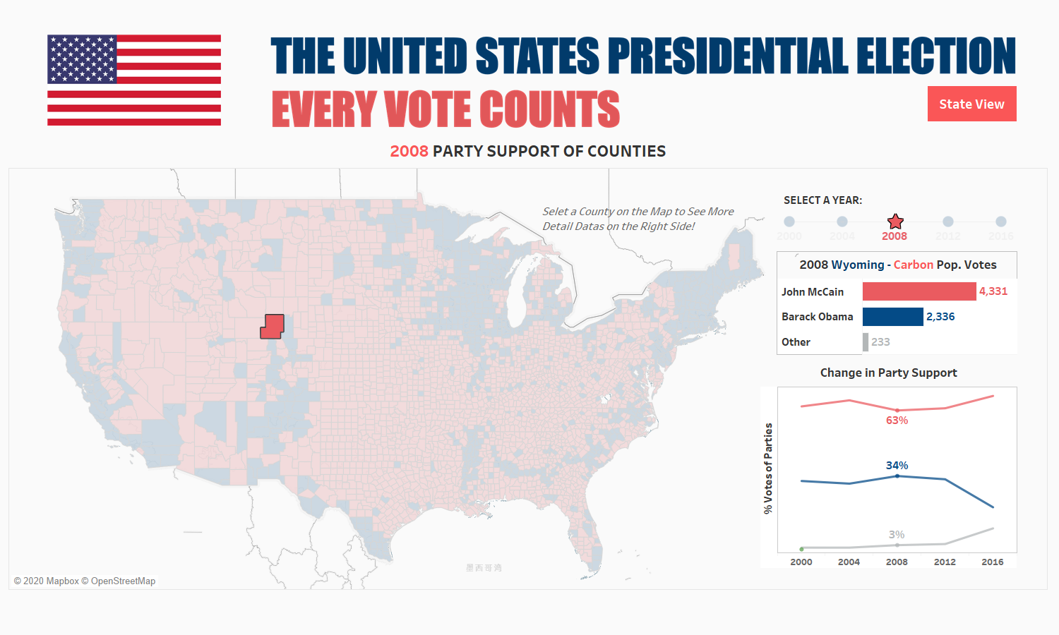 4. County View: I create a county view as well, to show the voting in each county. The calculation principle is basically the same as above. You can view the annual voting situation and trend as well of each county.