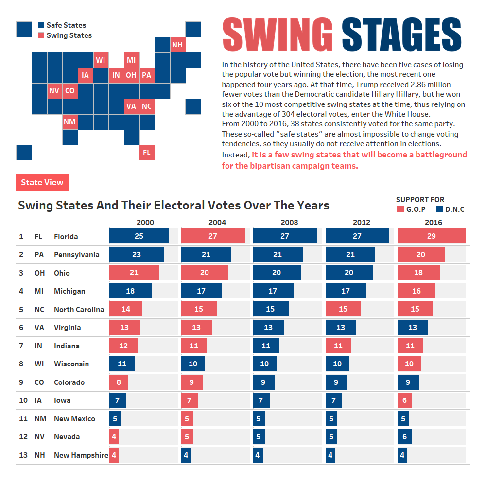 5. Find the Swing states: Here I take the states that have undergone changes in partisan support since 2000 as swing states. And highlight them in the tile map. And I use a bar chart shows their annual change in partisan support and the number of electoral votes each year.