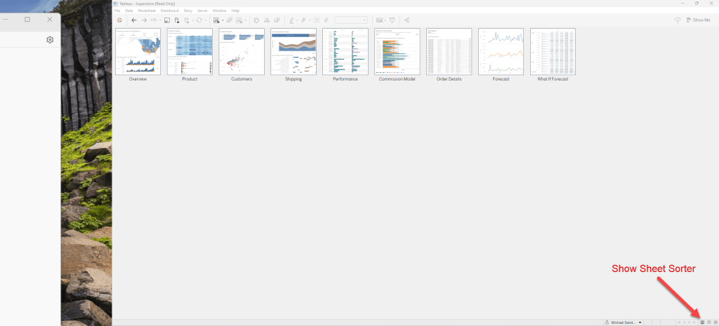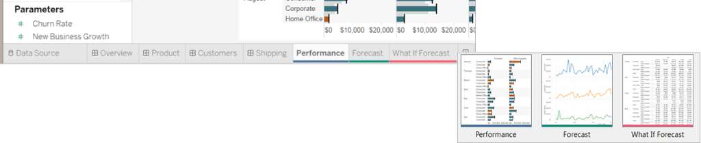 Similar to the sheet tabs, the filmstrip displays along the bottom of the workbook. However, instead of just sheet names, the filmstrip also shows a thumbnail image of each sheet. The filmstrip is useful when you are using Tableau to present your analysis and works well when you are working in Presentation mode.