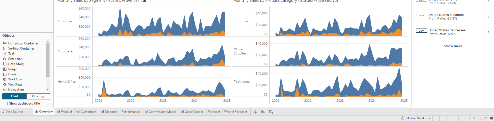 Similar to the sheet tabs, the filmstrip displays along the bottom of the workbook. However, instead of just sheet names, the filmstrip also shows a thumbnail image of each sheet. The filmstrip is useful when you are using Tableau to present your analysis and works well when you are working in Presentation mode.