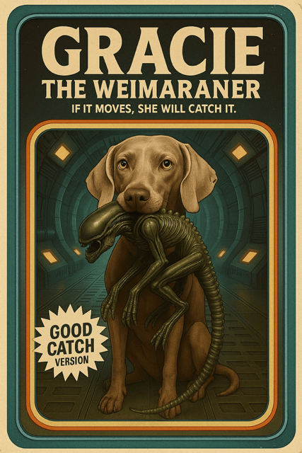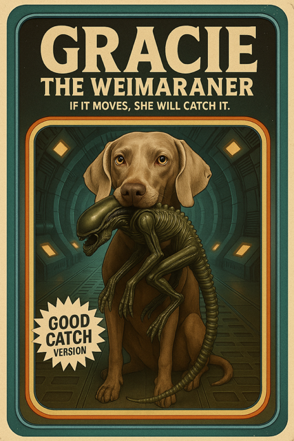I saw this in another context, and decided that my Gracie would gently carry any animal she found back to me, even an Alien (from the movie Aliens). Here is my action figure for Gracie and the alien she caught. RIP sweetie.